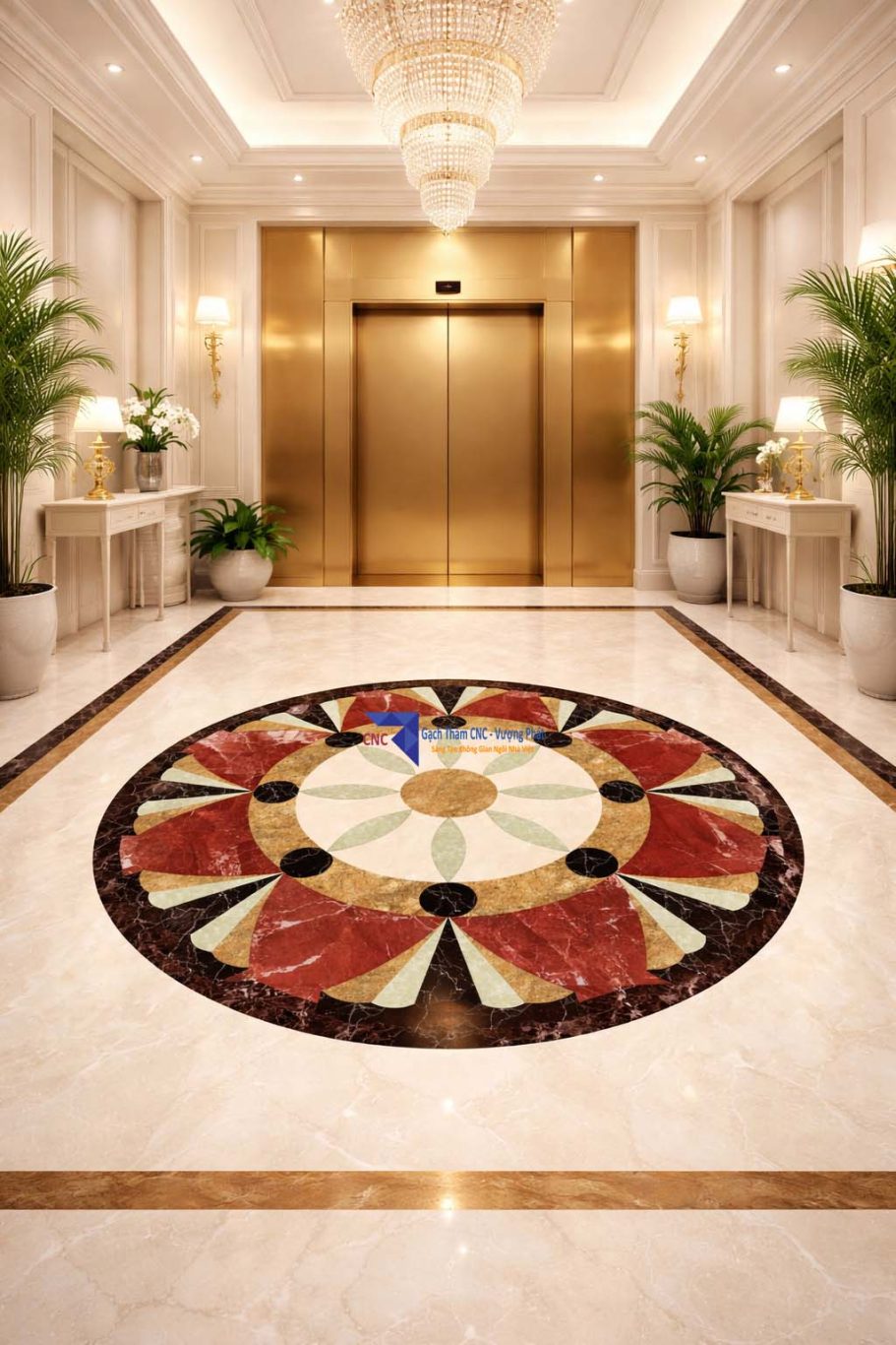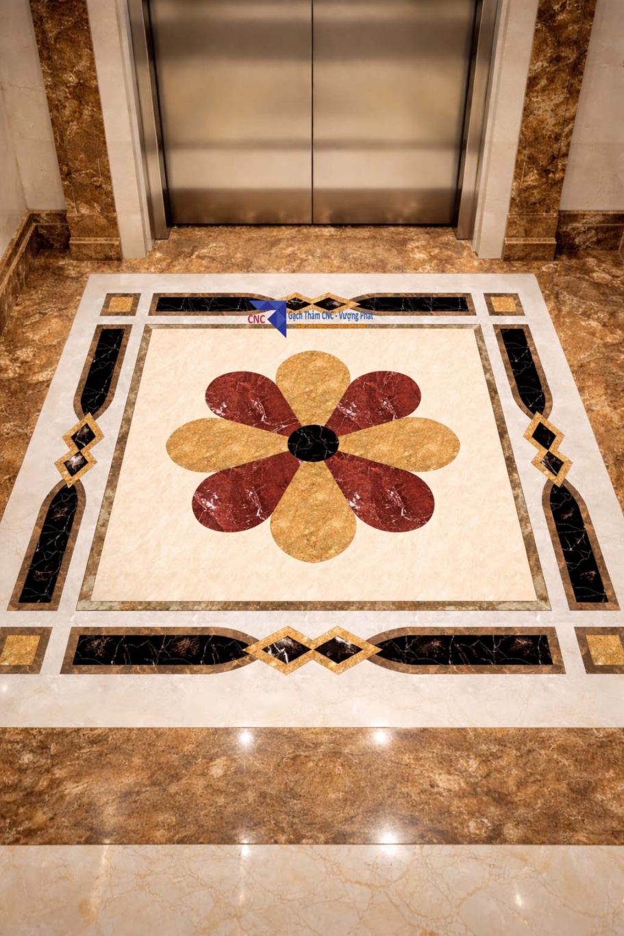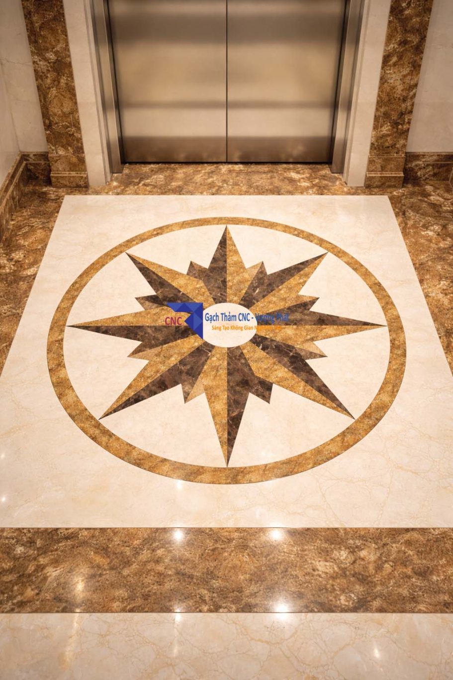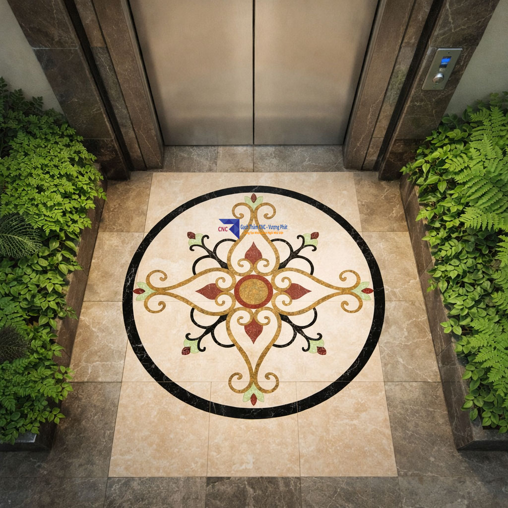Nhiều công trình hiện nay lựa chọn gạch thảm cắt CNC hoặc ghép họa tiết đá để khu vực cửa thang máy trở nên nổi bật hơn, đồng thời tạo sự đồng bộ với tổng thể nội thất.